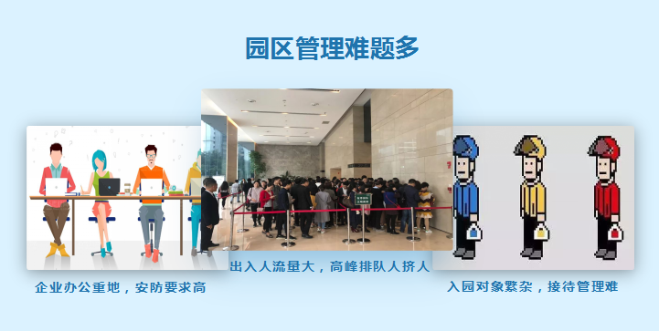 隨著現(xiàn)代園區(qū)的規(guī)?;l(fā)展,越來越多的企業(yè)入駐,園區(qū)內(nèi)容納了內(nèi)部物業(yè)管理人員、商戶、租售物業(yè)業(yè)主及員工、商務(wù)訪客等,人員出入口控制管理難度大大提高。