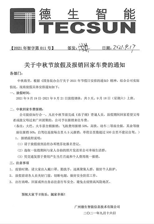 德生訪客易中秋節(jié)放假通知