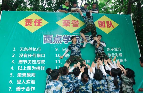 “翻越畢業(yè)墻”這是本次拓展中最后一個(gè)挑戰(zhàn),也是最艱難的一個(gè)挑戰(zhàn)。這堵4米多高的墻,翻過(guò)了,我們都成功畢業(yè);沒(méi)翻過(guò),它將成為我們的障礙墻。