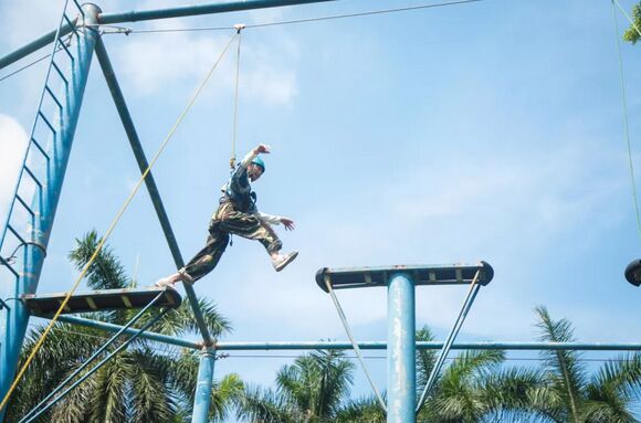 對(duì)于恐高的小伙伴來(lái)說(shuō),“高空斷橋”是個(gè)極具挑戰(zhàn)性的項(xiàng)目。但是,41名德生人沒(méi)有人想過(guò)放棄。