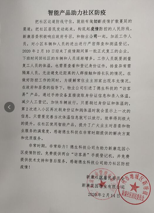 2020年2月10日迎來了疫情期間第一批正式復工的企業(yè),下班時間回社區(qū)的車輛和人員逐漸增多。工作人員既要測量復工人員的體溫,也需要查看和登記身份證件,排查異常需隔離人員,無法避免近距離的人群接觸和排長隊的情況。在做好防控工作的同時,為緩解常住業(yè)主回家出現(xiàn)車龍情況,在政府和居委會的指導下,物業(yè)公司引進了德生科技的社區(qū)人員實名體溫監(jiān)測疫情防控管理系統(tǒng),通過手持設備直接讀取信息和錄入體溫,第2次進入小區(qū)再次刷身份證和測溫時就會顯示上一次的信息,只需要完善當次體溫信息就可以放行,效率得到極大的提升,獲得了社區(qū)領導、工作人員、業(yè)主的極大滿意,備受好評!